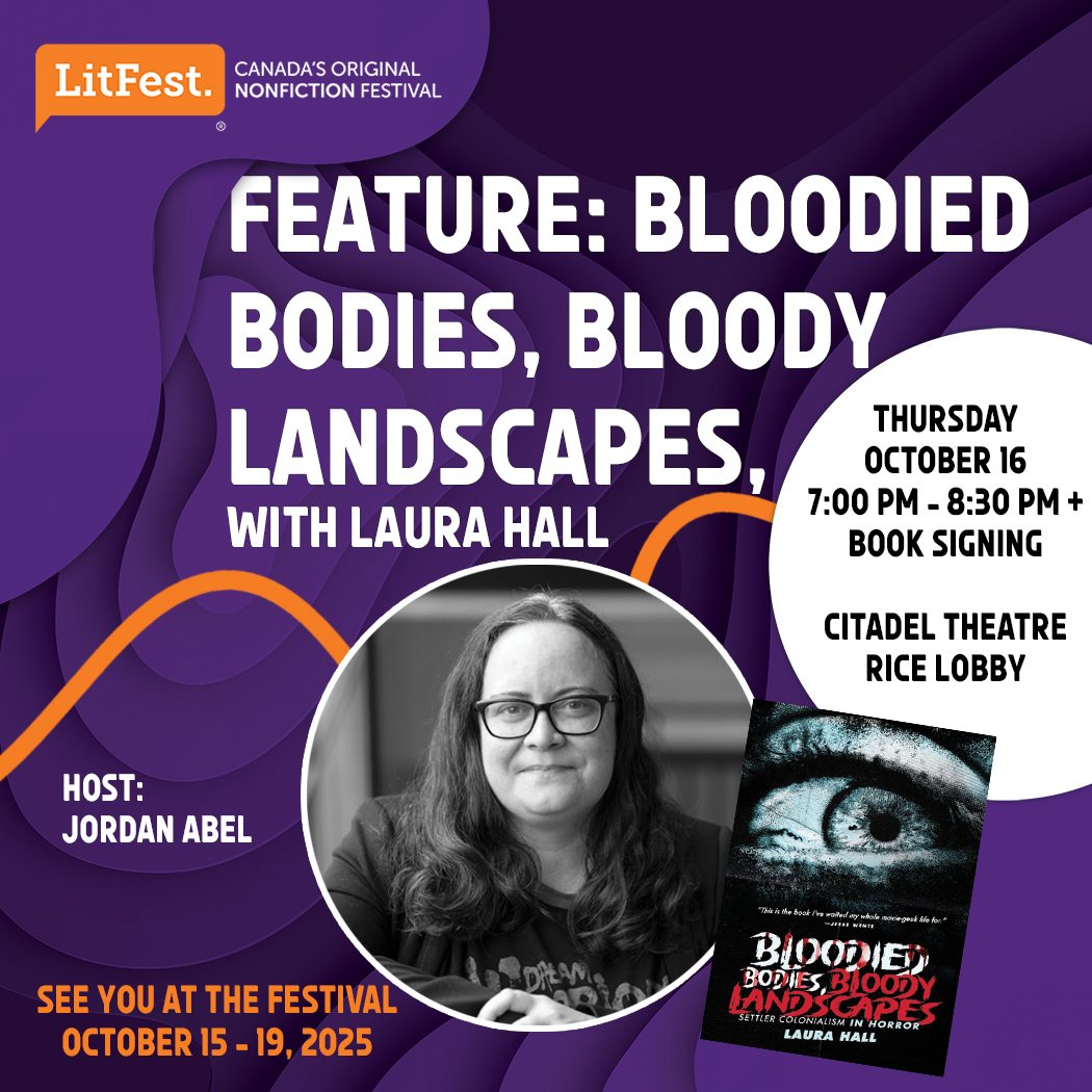In Conversation event featuring Laura Hall speaking with University of Alberta associate professor Jordan Abel about her book Bloodied Bodies, Bloody Landscapes: Settler Colonialism in Horror.